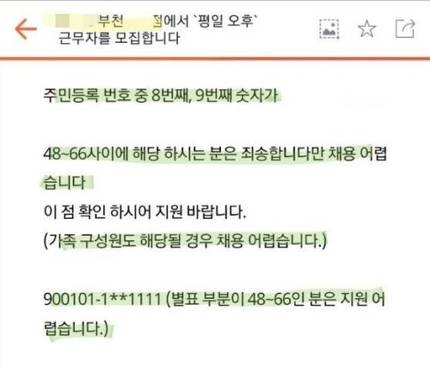 이에 더해 '가족 구성원이 해당 숫자가 포함된 주민번호를 갖는 경우 역시 채용이 어렵다'고 명시했다.