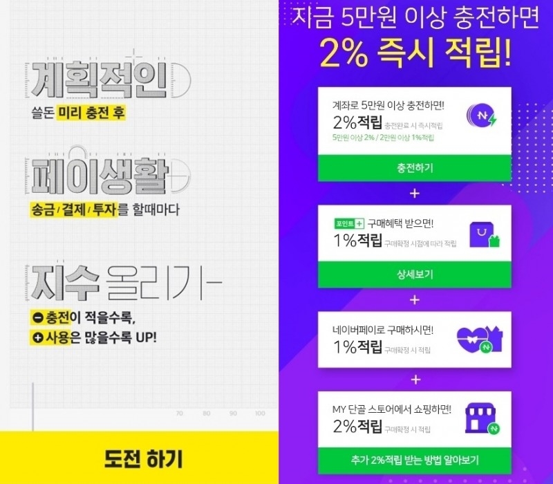네이버페이 또한 아직 적립금 충전 혜택을 폐지하지 않고 있다. 네이버페이는 5만원 이상 충전하면 2% 즉시 포인트가 적립된다며 평균 잔액 이상의 선불금을 충전하도록 홍보하고 있다.