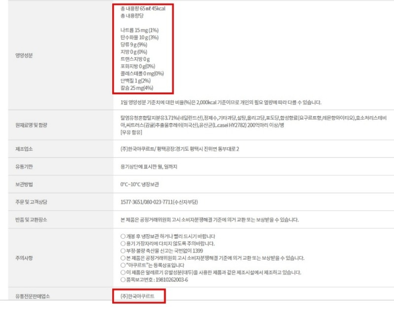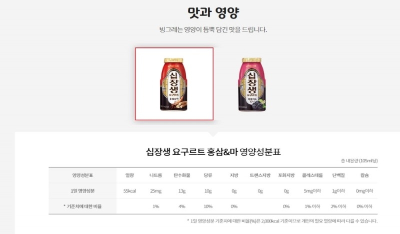 빙그레 홈페이지에 들어가 십장생 요구르트 성분표를 살펴봤다.
