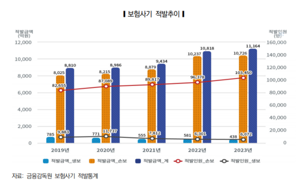 금융감독원 자료에 따르면 보험사기 적발 금액은 매년 증가해 2023년에는 1조 1164억 원에 달했다. 같은 해 보험사기로 적발된 인원은 10만9522명, 1인당 평균 적발 금액은 1020만원으로 고액화 추세를 보이고 있다.