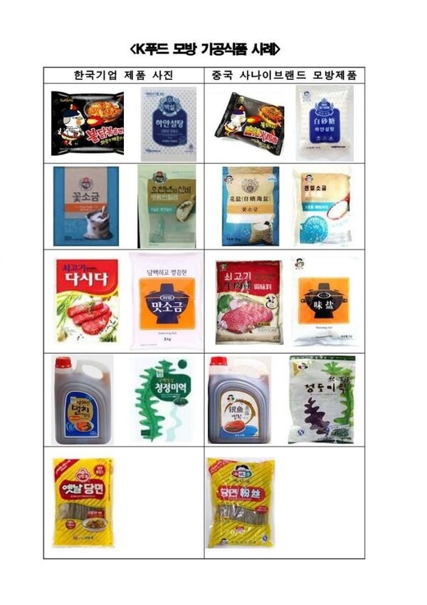 실제 중국 법원은 지난해 5월 한국 식품을 모방해 짝퉁 조미료와 라면, 소금 등을 팔아온 중국 업체에 대해 "한국 식품 업체에 10만~20만위안(1868만~3730만원)의 배상금을 지급하라"는 판결을 내렸다. 앞서 2021년 말 CJ제일제당과 삼양식품, 대상, 오뚜기 등 국내 식품 업체 4곳이 한국식품산업협회와 'K푸드 모조품 근절을 위한 공동협의체'를 구성해 가짜 한국 식품을 만들어 판 태양초식품유한공사·정도식품유한공사를 대상으로 '지적 재산권(IP) 침해' 소송을 제기한 데 따른 조치다.