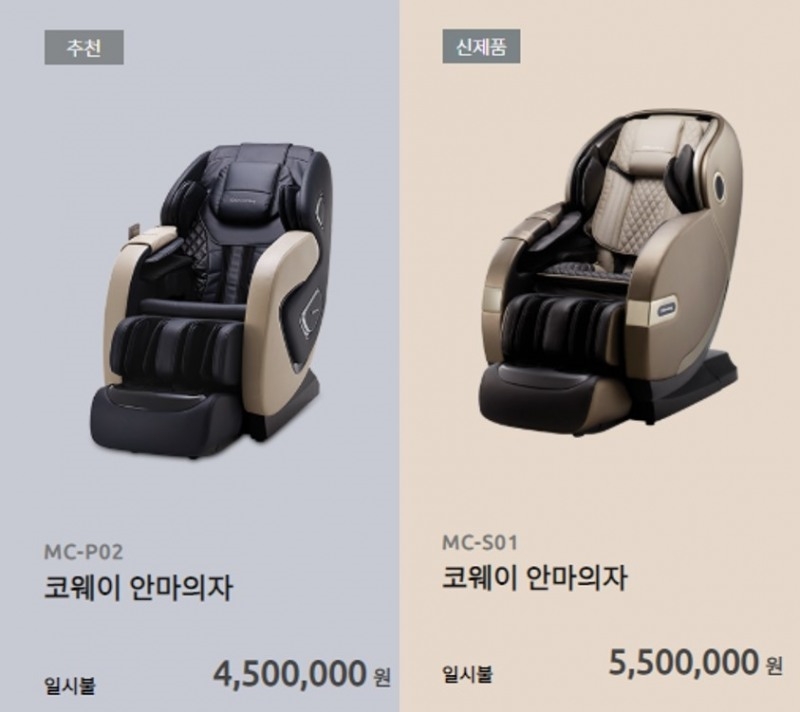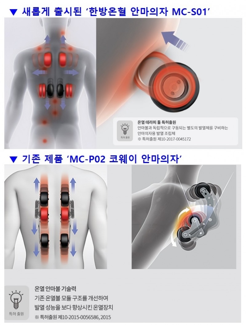 척추온열안마 기능이 한방온혈안마로 둔갑해 은근슬쩍 가격까지 100만원이나 인상했다. MC-P02 코웨이 안마의자는 450만원, 한방온혈 안마의자 MC-S01은 550만원이다.