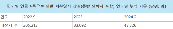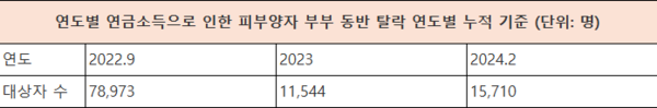 실제로 올해 2월 기준 오로지 공무원·사학·군인·국민연금 등 공적연금 소득이 연간 2000만원을 넘어서 피부양자에서 탈락한 사람은 4만3326명이다. 이 중에서 부부 동반 탈락자는 1만5710명에 달한다.