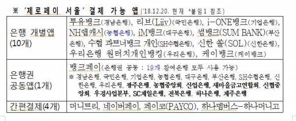 현재 제로페이가 가능한 은행은 ▲경남 ▲광주 ▲국민 ▲기업 ▲농협은행 ▲농협중앙회 ▲대구 ▲부산 ▲산업 ▲새마을금고중앙회 ▲SH수협 ▲신한 ▲신협 ▲우리 ▲우정사업본부 ▲SC제일 ▲전북 ▲제주 ▲케이뱅크 ▲하나 등이다.