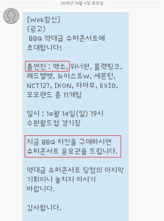 논란은 오는 14일 수원 월드컵경기장에서 열리는 슈퍼콘서트에 앞서 BBQ 측이 보낸 문자가 발단이 됐다.