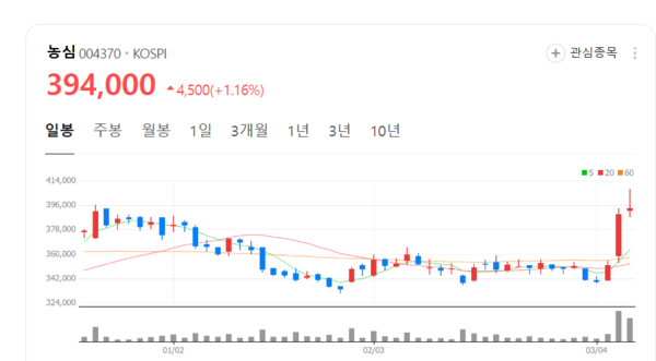 IBK투자증권은 최근 보고서에서 농심의 가격 인상 결정을 긍정적으로 평가하며 목표주가를 기존 45만 원에서 50만 원으로 11.1% 상향 조정하고, 투자의견은 '매수'를 유지했다.