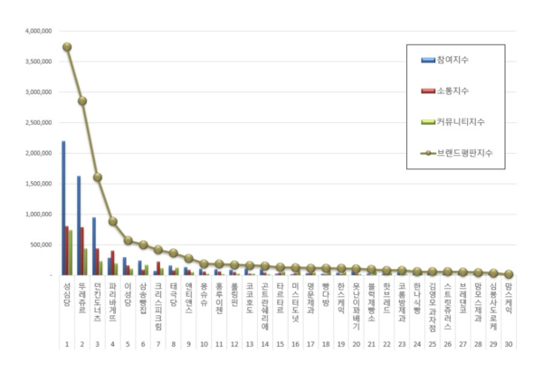 제과제빵 전문점 브랜드평판 1위를 기록한 성심당 브랜드는 참여지수 2,194,181 소통지수 802,613 커뮤니티지수 740,655가 되면서 브랜드평판지수 3,737,449로 분석됐다. 지난 2월 브랜드평판지수 3,875,405와 비교해보면 3.56% 하락했다.