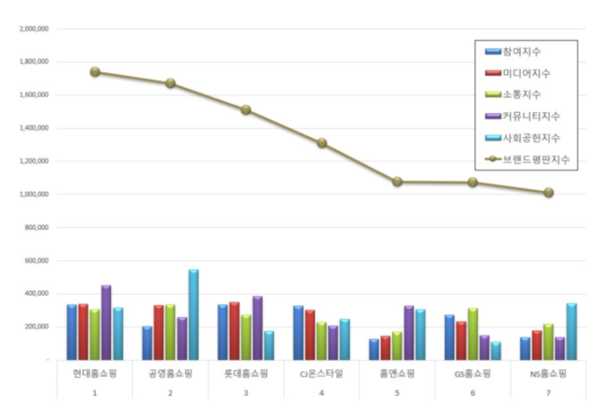 2위, 공영홈쇼핑 브랜드는 참여지수 202,617 미디어지수 331,292 소통지수 332,234 커뮤니티지수 258,048 사회공헌지수 546,432가 되면서 브랜드평판지수 1,670,623으로 분석됐다. 지난 3월 브랜드평판지수 1,764,509와 비교해보면 5.32% 하락했다.