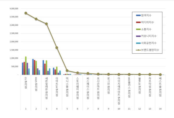 편의점 브랜드평판 분석은 참여지수, 미디어지수, 소통지수, 커뮤니티지수, 사회공헌지수로 구분하여 브랜드평판지수를 산출했다. 신제품런칭센터가 진행한 브랜드 유통에 대한 평가도 포함됐다.