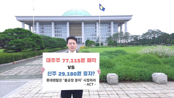 이상목 액트 대표는 "롯데라는 브랜드를 믿고 공모가 5만9000원에 투자한 개인 투자자들이 현재 3만 원 대의 주가를 감내하고 있음에도, 정작 기업은 대주주와 사모펀드 간 거래에만 유리한 구조를 선택했다"면서 "이는 기존 주주의 재산권을 본질적으로 침해하는 행위로, 주주의 위임을 받은 액트는 모든 수단을 동원해 시정을 요구할 것"이라고 밝혔다.