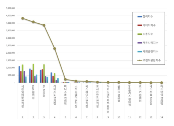 편의점 브랜드평판 분석은 참여지수, 미디어지수, 소통지수, 커뮤니티지수, 사회공헌지수로 구분하여 브랜드평판지수를 산출했다. 신제품런칭센터가 진행한 브랜드 유통에 대한 평가도 포함됐다.