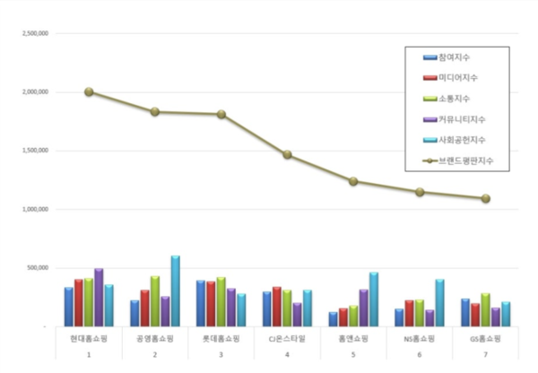 5위, 홈앤쇼핑 브랜드는 참여지수 123,965 미디어지수 157,253 소통지수 179,699 커뮤니티지수 317,388 사회공헌지수 462,670이 되면서 브랜드평판지수 1,240,974로 분석됐다. 지난 10월 브랜드평판지수 1,346,016과 비교해보면 7.80% 하락했다.