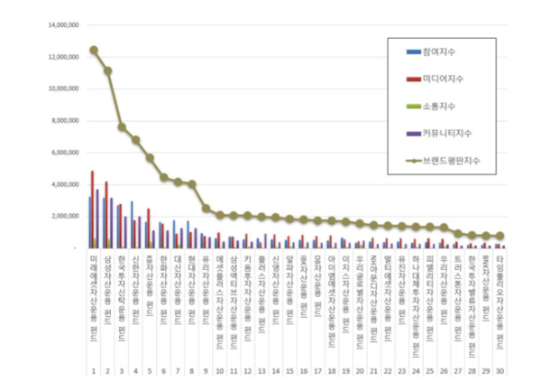 펀드 브랜드평판 1위를 기록한 미래에셋자산운용 펀드 브랜드는 참여지수 3,254,912 미디어지수 4,857,526 소통지수 629,300 커뮤니티지수 3,716,763이 되면서 브랜드평판지수 12,458,500으로 분석됐다. 지난 10월 브랜드평판지수 11,449,807과 비교해보면 8.81% 상승했다.
