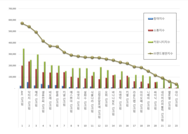 11월 선크림 브랜드평판 순위는 AHC, 닥터지, 헤라, 셀퓨전씨, 비오레, 랑콤, 키넬, 에스쁘아, 아넷사, 설화수, 식물나라, 김정문알로에, 오휘, 바나나보트, 차앤박, 키엘, 라운드랩, 아이오페, 니베아, 싸이닉, 네이처리퍼블릭, 엘로엘, 야다 선크림 순으로 분석됐다.