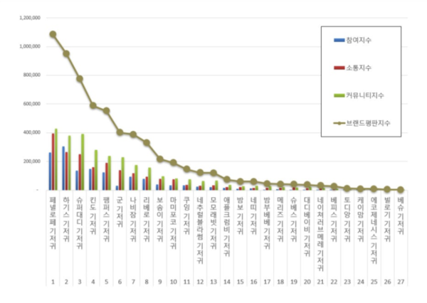 5위, 팸퍼스 기저귀 브랜드는 참여지수 124,230 소통지수 189,009 커뮤니티지수 238,820이 되면서 브랜드평판지수 552,059로 분석됐다. 지난 10월 브랜드평판지수 577,032와 비교해보면 4.33% 하락했다.