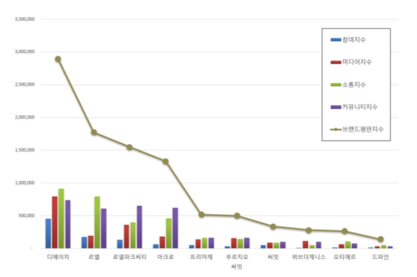 2위, 롯데건설 르엘 브랜드는 참여지수 175,917 미디어지수 192,617 소통지수 795,426 커뮤니티지수 609,257이 되면서 브랜드평판지수 1,773,217로 분석됐다. 지난 10월 브랜드평판지수 1,665,579와 비교해보면 6.46% 상승했다.