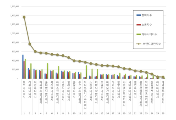 브랜드에 대한 평판은 브랜드에 대한 소비자들의 활동 빅데이터를 참여가치, 소통가치, 소셜가치, 시장가치, 재무가치로 나누게 된다. 바디워시 브랜드평판지수는 참여지수, 소통지수, 커뮤니티지수로 분석했다.