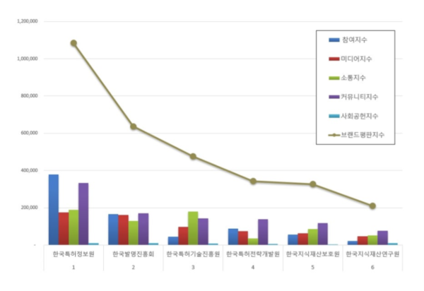 11월 특허청 공공기관 브랜드평판 순위는 한국특허정보원, 한국발명진흥회, 한국특허기술진흥원, 한국특허전략개발원, 한국지식재산보호원, 한국지식재산연구원 순이었다.