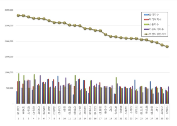 11월 배우 브랜드평판 30위 순위는 강하늘, 이준호, 최우식, 조우진, 이정재, 김영광, 천우희, 안은진, 김우빈, 진영, 라미란, 이병헌, 정소민, 김민하, 고규필, 김지훈, 전여빈, 류승룡, 이레, 차은우, 장동주, 신슬기, 이광수, 김선영, 박지환, 최성은, 전지현, 수지, 이영애, 고윤정 순이었다.
