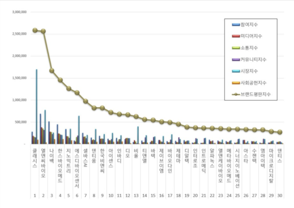 2위, 엘앤씨바이오 브랜드는 참여지수 690,644 미디어지수 381,619 소통지수 355,404 커뮤니티지수 322,764 시장지수 773,661 사회공헌지수 40,968이 되면서 브랜드평판지수 2,565,061로 분석됐다. 지난 10월 브랜드평판지수 4,495,716과 비교해보면 42.94% 하락했다.