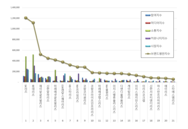 2위, 롯데리츠 브랜드는 참여지수 64,317 미디어지수 50,857 소통지수 521,833 커뮤니티지수 311,032 시장지수 168,767이 되면서 브랜드평판지수 1,116,807로 분석됐다. 지난 10월 브랜드평판지수 1,155,794와 비교해보면 3.37% 하락했다.