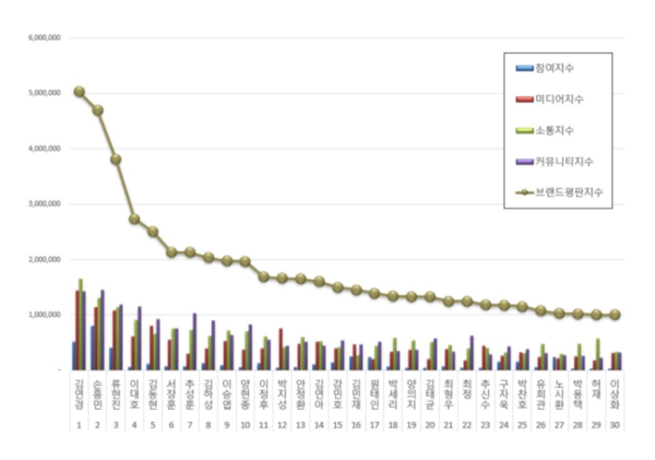 10월 26일부터 11월 26일까지 측정한 스포츠 스타 브랜드 빅데이터 67,846,537개를 소비자 행동분석을 통해 스타 브랜드에 대한 참여지수, 미디어지수, 소통지수, 커뮤니티지수를 측정했다. 지난 10월 스포츠 스타 브랜드 빅데이터 81,494,523개와 비교하면 16.75% 줄어들었다. 세부 분석을 보면 브랜드소비 22.23% 하락, 브랜드이슈 6.02% 하락, 브랜드소 20.61% 하락, 브랜드확산 18.64% 하락했다.