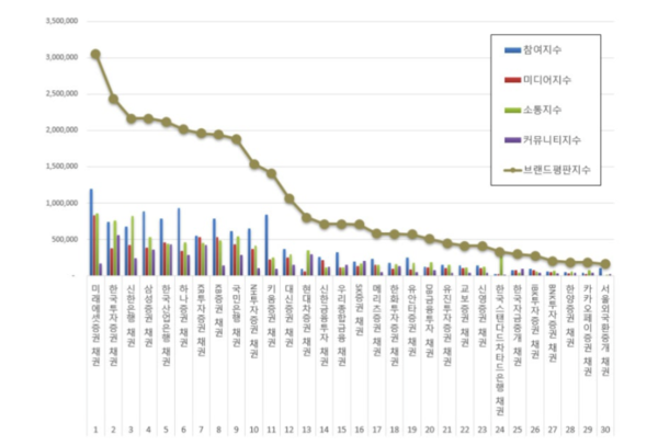 채권 브랜드평판 1위를 기록한 미래에셋증권 채권 브랜드는 참여지수 1,196,380 미디어지수 830,569 소통지수 860,349 커뮤니티지수 165,872이 되면서 브랜드평판지수 3,053,170으로 분석됐다. 지난 10월 브랜드평판지수 3,176,413과 비교해보면 3.88% 하락했다.