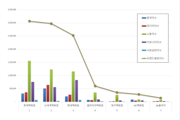 5위, 대구백화점 브랜드는 참여지수 14,775 미디어지수 21,068 소통지수 262,778 커뮤니티지수 55,266 사회공헌지수 4,056이 되면서 브랜드평판지수 357,943으로 분석됐다. 지난 9월 브랜드평판지수 412,314와 비교해보면 13.19% 하락했다.