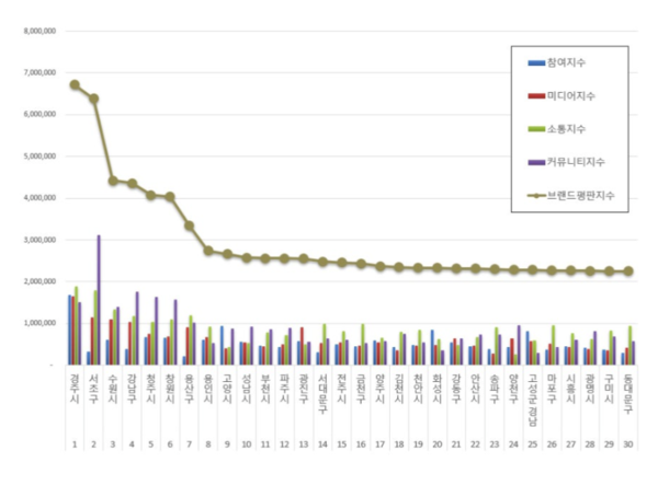 11월 대한민국 기초자치단체 브랜드평판 30위 순위는 경주시, 서초구, 수원시, 강남구, 청주시, 창원시, 용산구, 용인시, 고양시, 성남시, 부천시, 파주시, 광진구, 서대문구, 전주시, 금천구, 양주시, 김천시, 천안시, 화성시, 강동구, 안산시, 송파구, 양천구, 고성군 경남, 마포구, 시흥시, 광명시, 구미시, 동대문구 순으로 분석됐다.