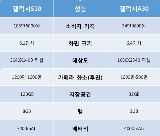 업계에 따르면 갤럭시A30과 갤럭시 S10의 주된 차이는 저장공간과 디스플레이 해상도, 카메라 화소 등이다. 갤럭시A30이 32GB의 저장공간과 1080X2340 픽셀, 1600만·500만 카메라 화소를 지닌 반면, 갤럭시 S10은 각각 128GB, 3040X1400 픽셀, 1200만·1600만 화소다.
