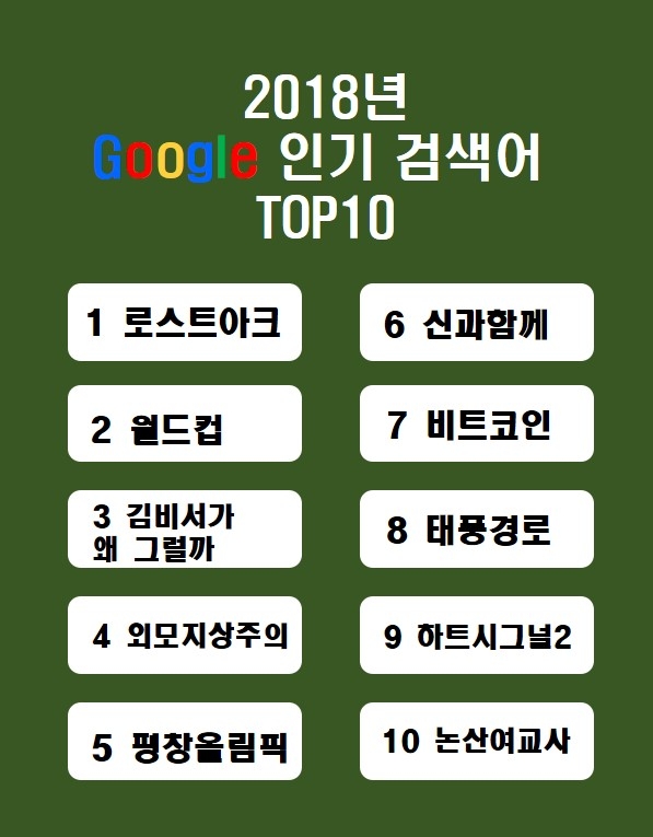 2018년 국내 인기 검색어 종합 순위는 ①로스트아크 ②월드컵 ③김비서가 왜 그럴까 ④외모지상주의 ⑤평창올림픽 ⑥신과함께 ⑦비트코인 ⑧태풍 경로 ⑨하트시그널2 ⑩논산 여교사로 순으로 나타났다.