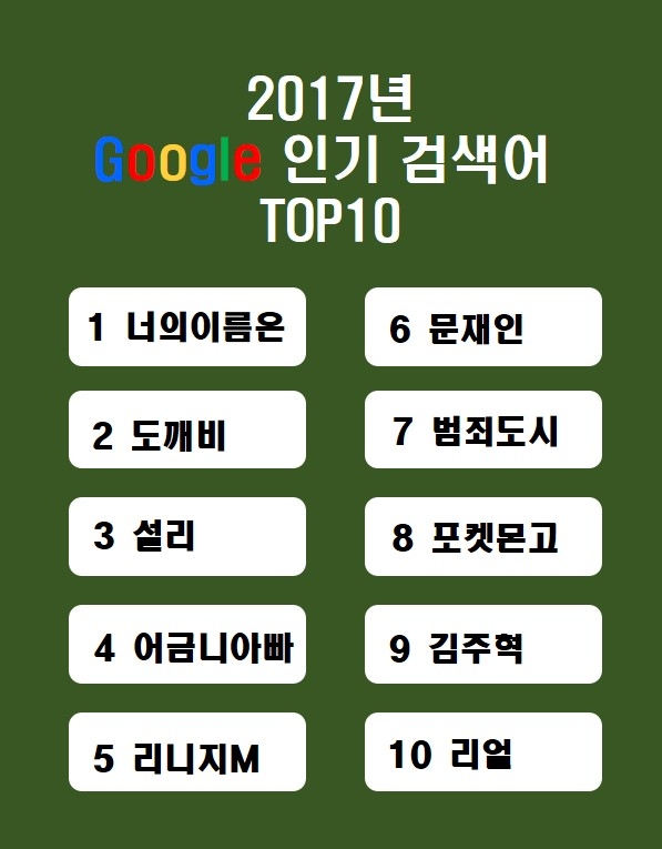 2017년 국내 인기 검색어 종합 순위는 ①너의 이름은 ②도깨비 ③설리 ④어금니 아빠 ⑤리니지M ⑥문재인 ⑦범죄도시 ⑧포켓몬 고 ⑨김주혁 ⑩리얼 순으로 나타났다.