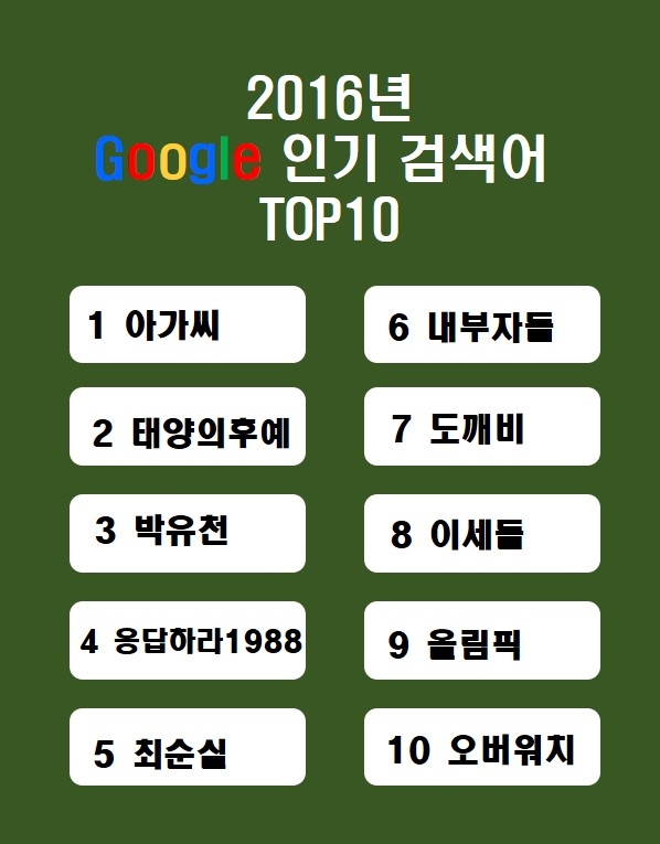 2016년 인기 검색어는 ①아가씨 ②태양의 후예 ③박유천 ④응답하라 1988 ⑤ 순실 ⑥내부자들 ⑦도깨비 ⑧이세돌 ⑨올림픽 ⑩오버워치 순으로 나타났다.