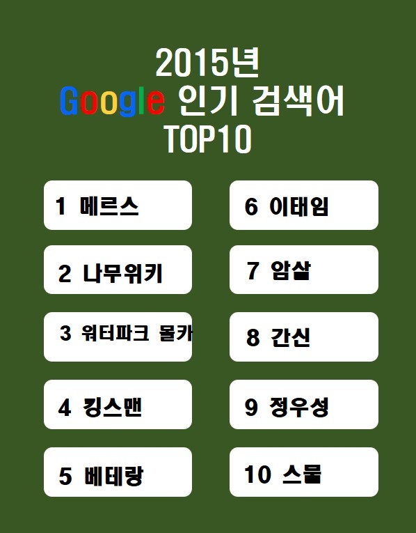 2015년 한국 최다 검색어는 1위는 메르스였으며 다음은 나무위키, 워터파크 몰카, 킹스맨, 베테랑, 이태임, 암살, 간신, 장성우, 스물 등이 뒤를 이었다.