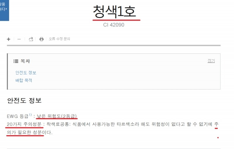 한미약품 구강청결제 케어가글의 타르색소는 '청색1호'다. 청색1호의 안전도 정보(EWG) 등급은 낮은 위험도(2등급)으로 섭취에 대한 주의를 명확히 기재하고 있다.