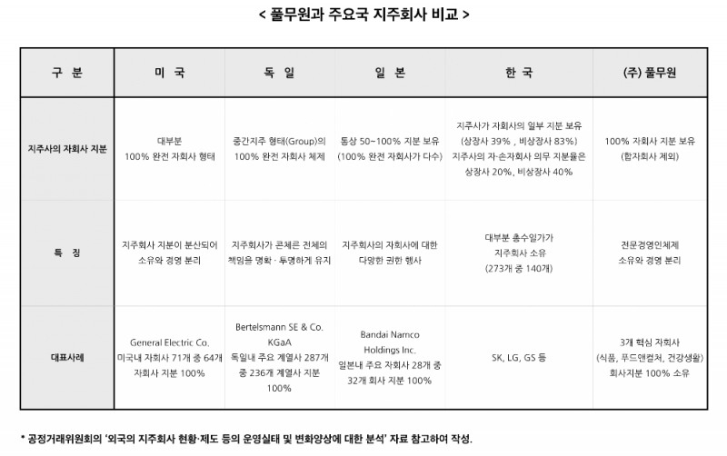 ㈜풀무원 김종헌 재무관리실장은 “지주회사제도는 아시아 금융위기 이후 1999년에 기업 소유구조의 투명성 제고와 지배구조의 괴리도를 낮춰 건전한 지배구조를 구축하고자 국내에 도입되었다”며“이 같은 취지에 따라 서구 선진국의 지주회사는 대부분 자회사를 100% 보유하고 있다"고 설명했다.