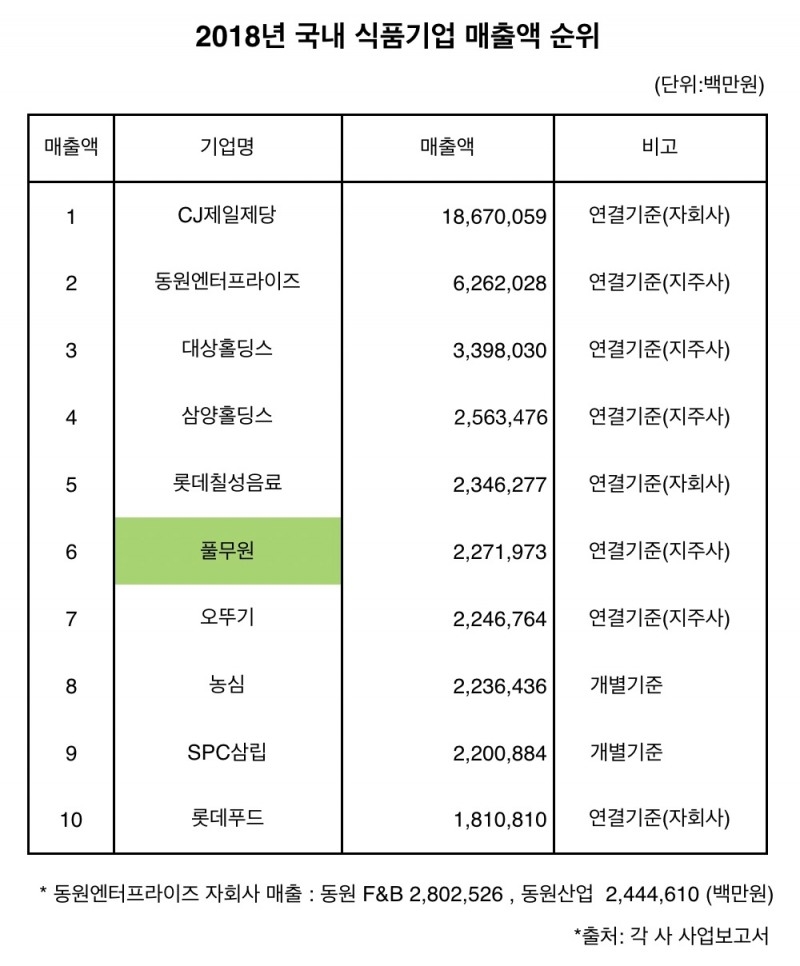 ㈜풀무원은 2018년 말 연결회계기준으로 창사 35년 만에 최대 매출인 2조 2,720억원(2018년말 연결재무제표 기준)을 기록하였으며, 이 순위는 국내 10대 식품기업에 해당한다고 설명했다.