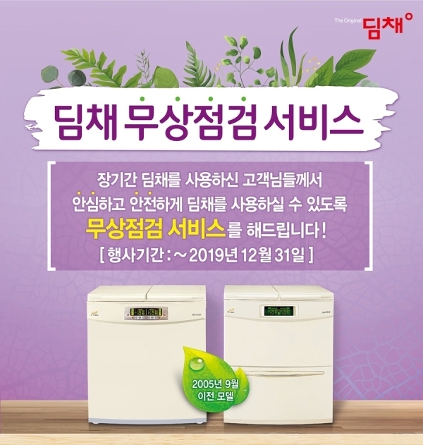 [핀포인트뉴스=이승현 기자] 대유위니아가 14년 이상 된 자사 김치냉장고 '딤채'를 이용하는 고객을 대상으로 올해 연말까지 무상점검 서비스를 진행한다.