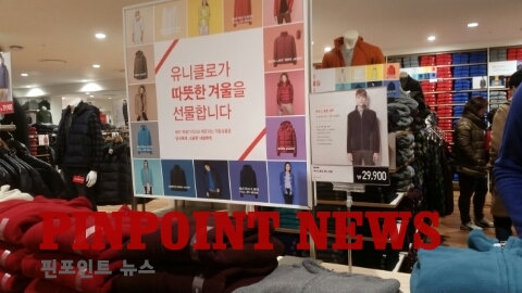 유니클로의 주력 상품인 '후리스' 코너는 몰려든 사람들로 발 디딜 틈이 없다. 매대는 소비자들의 방문 흔적을 증명이라도 하듯, 어질러진 흔적이 고스란히 남아 있다. 잘 정돈된 옷가지 위로 대자로 펼쳐져 놓인 옷들이 한가득이다.