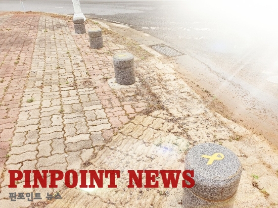 오후 4시께 도착한 목포 신항만 세월호 안착장 입구. 인도 진입 방지돌에 세월호의 상징인 노란 리본이 부착돼 있다. 색이 바랜 리본 스티커 위로 쏟아진 저녁 햇살은 이제는 잊혀진 국민들의 관심과 희생자들을 기리는 유가족들의 마음을 대변하는 듯 했다.