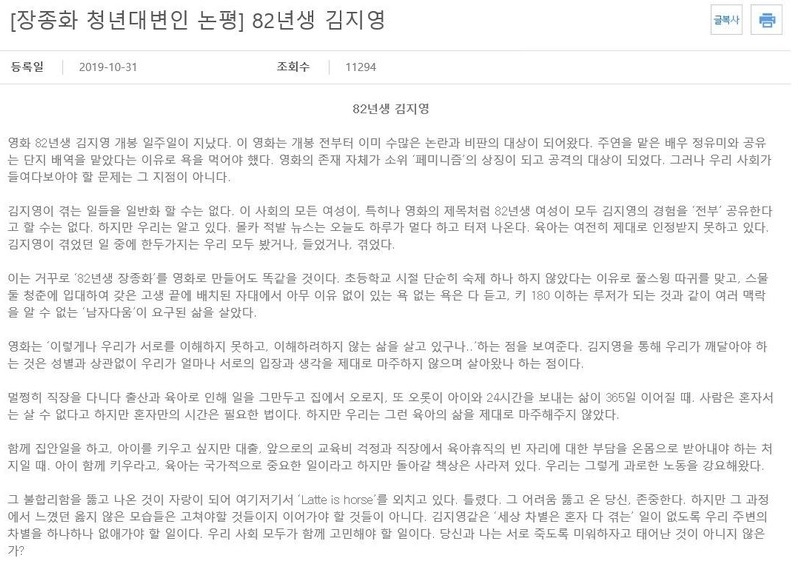 영화 '82년생 김지영(감독 김도영)'은 상영 초기만 해도 각종 논란에 휩싸였던 작품이다. 조남주 작가의 소설 '82년생 김지영'에 기반을 둔 탓인데 이 소설은 ▲소설임에도 통계를 인용한 점 ▲인용 통계자료의 모순(노동직군·근무시간 미고려) ▲60~70년대 일을 최근 일처럼 서술한 것 등을 이유로 많은 남성들의 비판을 받아왔다.