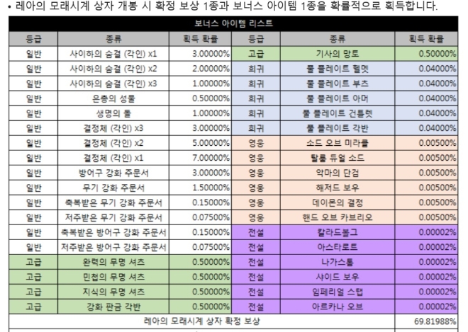 해당 아이템을 구입할 시, '레아의 모래시계 4개'를 확정적으로 획득할 수 있으며 이와 함께 확률형 아이템을 무작위로 부여받을 수 있다. 확률형 아이템 범주는 일반 등급 아이템(흰색)부터 고급(초록), 희귀(파랑), 영웅(빨강), 전설(보라)급 아이템까지 이른다.