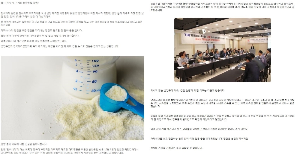 한 맘카페 게시물에는 "혹시 계속하시나요? 남양유업 불매?"라는 제목을 시작으로 가짜 갑질뉴스로 진실이 덮이고 있는 상황이라면서 진실을 가려내는 안목이 필요하다는 당부를 남기는가 하면, "불매운동이나 각종 악성 루머가 가시고 있지 않아 회사와 대리점 모두가 악질집단으로 매도되고 있다"는 등의 호소의 말이 담겨있다.