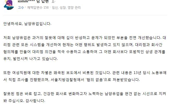 앞서 지난 1월 게시된 불매운동 관련 질문에는 자신이 남양유업 관계자임을 밝히면서 입장을 직접 해명하는 글이 발견되면서 여론의 뭇매를 맞은 바 있다.