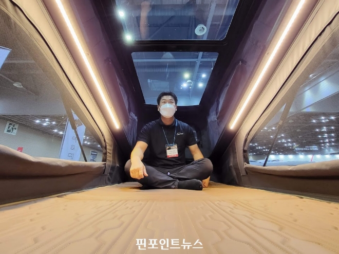 특히 자체 개발한 전후방 복합 개방 루프탑텐트는 기존 업체들과 달리 2단으로 설계돼 지하 주차장에 들어갈 수 있고, 공간감을 넓히면서 확장감을 느낄 수 있도록 했다. 천정부 강화유리를 통한 '파노라마 뷰'로 캠핑 중 눈이 오거나 비가 오는 경우 차 내에서 날씨의 변화를 느낄 수 있다.