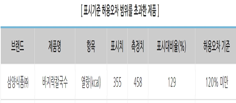 식약처가 고시한 '식품 등의 표시기준'에 따르면, 식품 제조업의 영양성분표시는 실제 측정값으로부터 오차 범위 120% 이하일 것을 규정하고 있다. 다만, 바지락칼국수의 오차 범위는 이를 상회(129%)하고 있어 한국소비자원의 권고를 수용, 개선이 불가피할 전망이다.