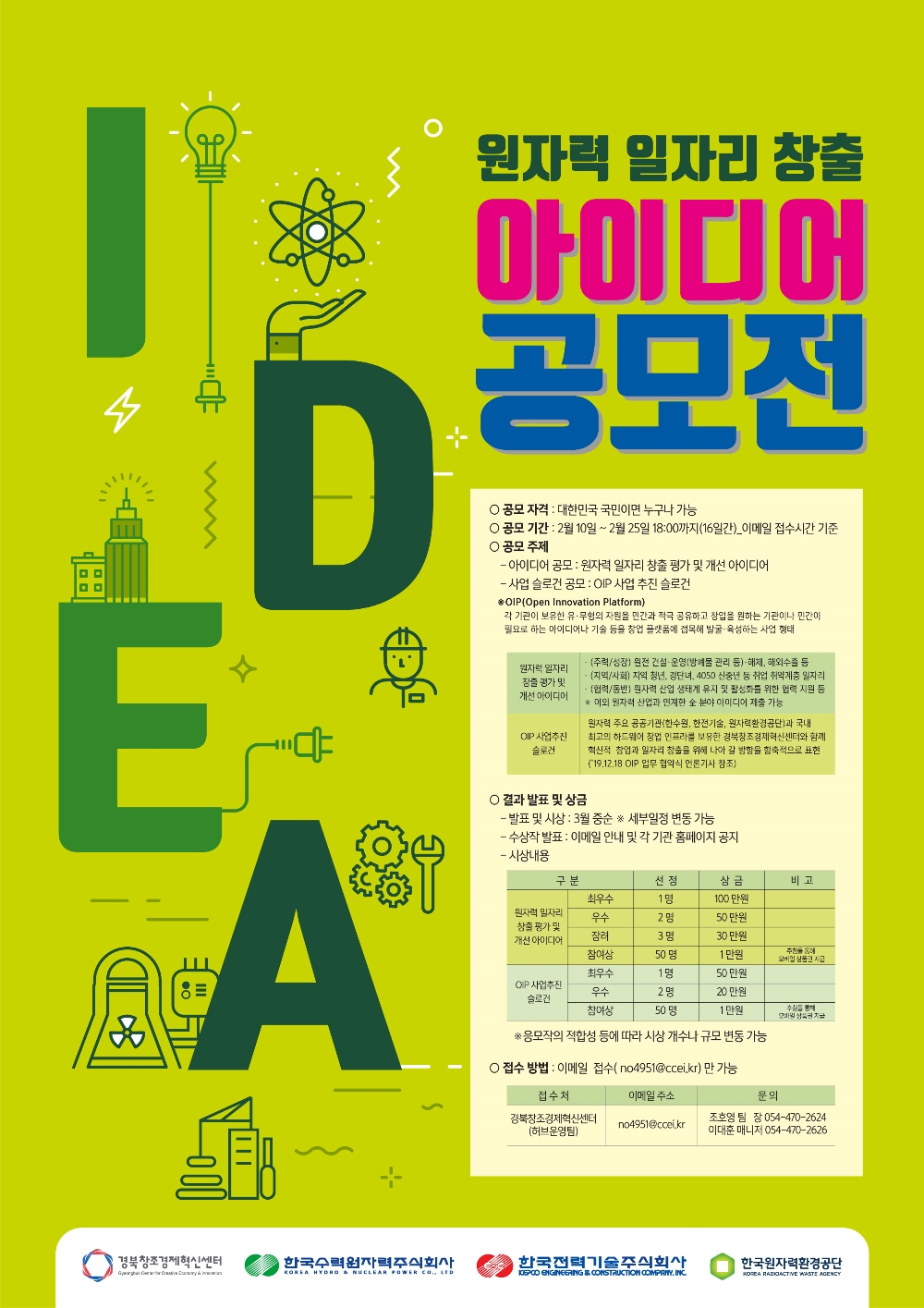 일자리 창출 아이디어 부분 공모 분야는 ▲방폐물 관리 등 원자력 주력사업 관련 일자리, ▲지역 및 사회 취약계층을 위한 일자리, ▲ 원자력산업 생태계 활성화를 위한 동반성장 일자리 등이다. OIP 사업추진 슬로건은 혁신적 창업과 일자리 창출을 위해 참여기관들이 협업해 나갈 방향을 담아야 한다.
