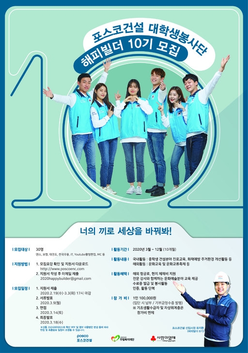 포스코건설은 2020년 한해 동안 국내외에서 다양한 사회공헌활동을 함께 할 대학생봉사단 '해피빌더(Happybuilder)' 10기를 모집한다고 17일 밝혔다.