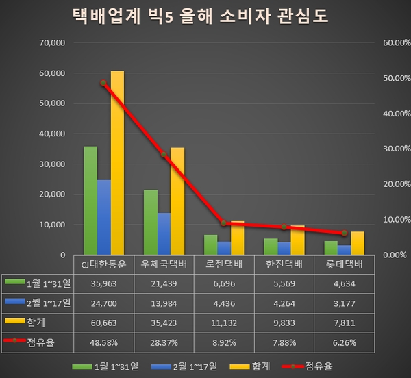 이들 5개사의 올해 1~2월 온라인 정보량을 살펴보면 CJ대한통운이 1월 3만5963건, 2월 2만4700건 등 총 6만663건으로 5개사 전체 정보량의 48.58%를 기록했다. CJ대한통운이 전체 소비자 관심도의 절반 가까이를 차지하고 있는 셈이다.