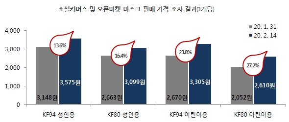소비자시민모임은 2020년 2월 14일(금) 소셜커머스(쿠팡, 위메프, 티몬)와 오픈마켓(11번가, G마켓) 등 5개 온라인쇼핑몰에서 판매하는 KF94 성인용․어린이용, KF80 성인용․어린이용 등 4개 보건용 마스크 품목의 가격을 조사한 결과, 4개 품목 모두 2주전(’20.1.31, 소비자시민모임 조사) 가격과 비교해 13.6~27.2% 상승한 것으로 나타났다.